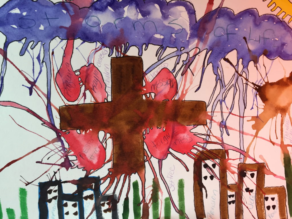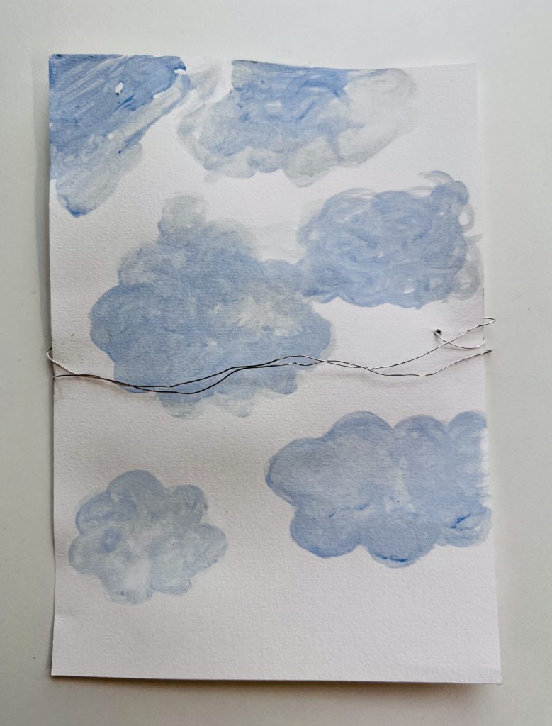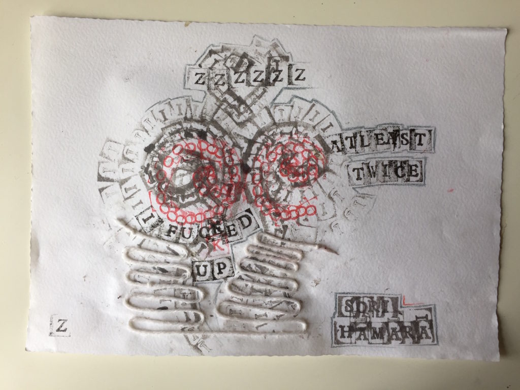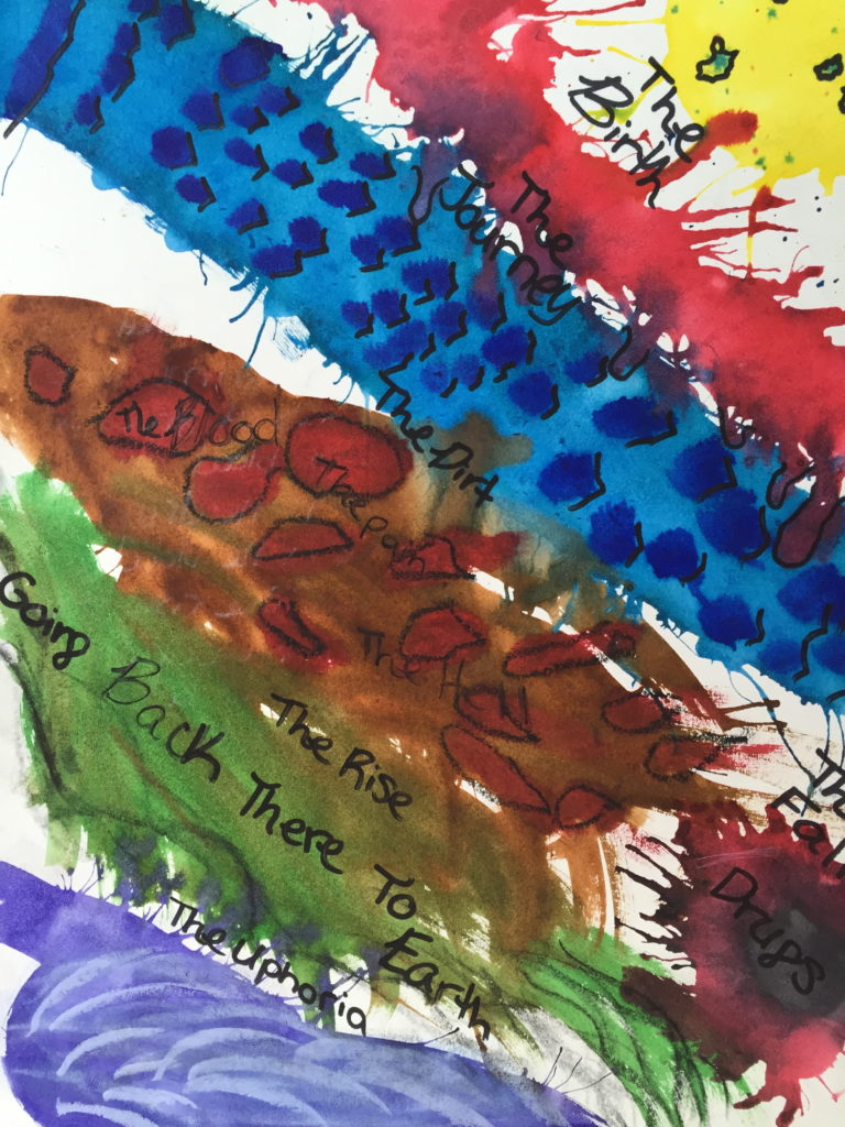 I go to take a piece of tin foil from the last bar of dark chocolate in the fridge. Thomas talked about chocolate in prison and using tin foil to make art. Resource of hope. Small pleasure. Granted to whom? I drew the woman figure on the left of a cardboard with pastels starting from the head and hair, pink body, then added the foil like a flame on the right. Colours added in an arch shape, finally the arms reaching out to the flame. There is blue inside the body, the other colours are warm. Shopping bags won’t help- my woman has her arms out. Where is soul burning? Is voice coming from without, from gesture, connection? Imperfectly alive.