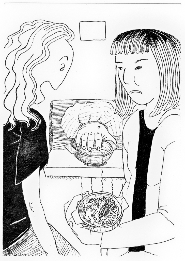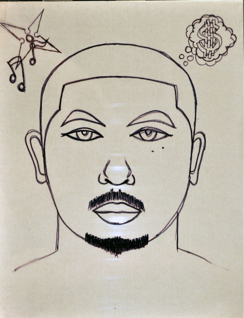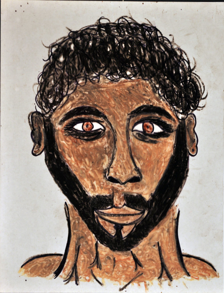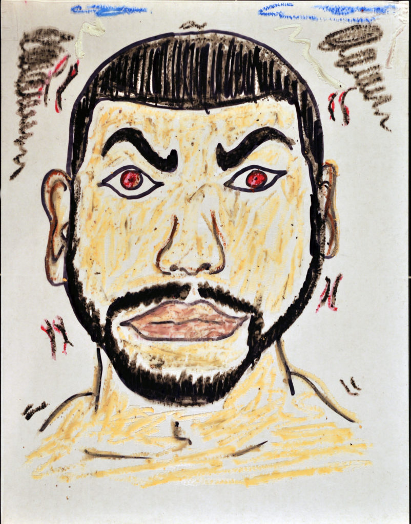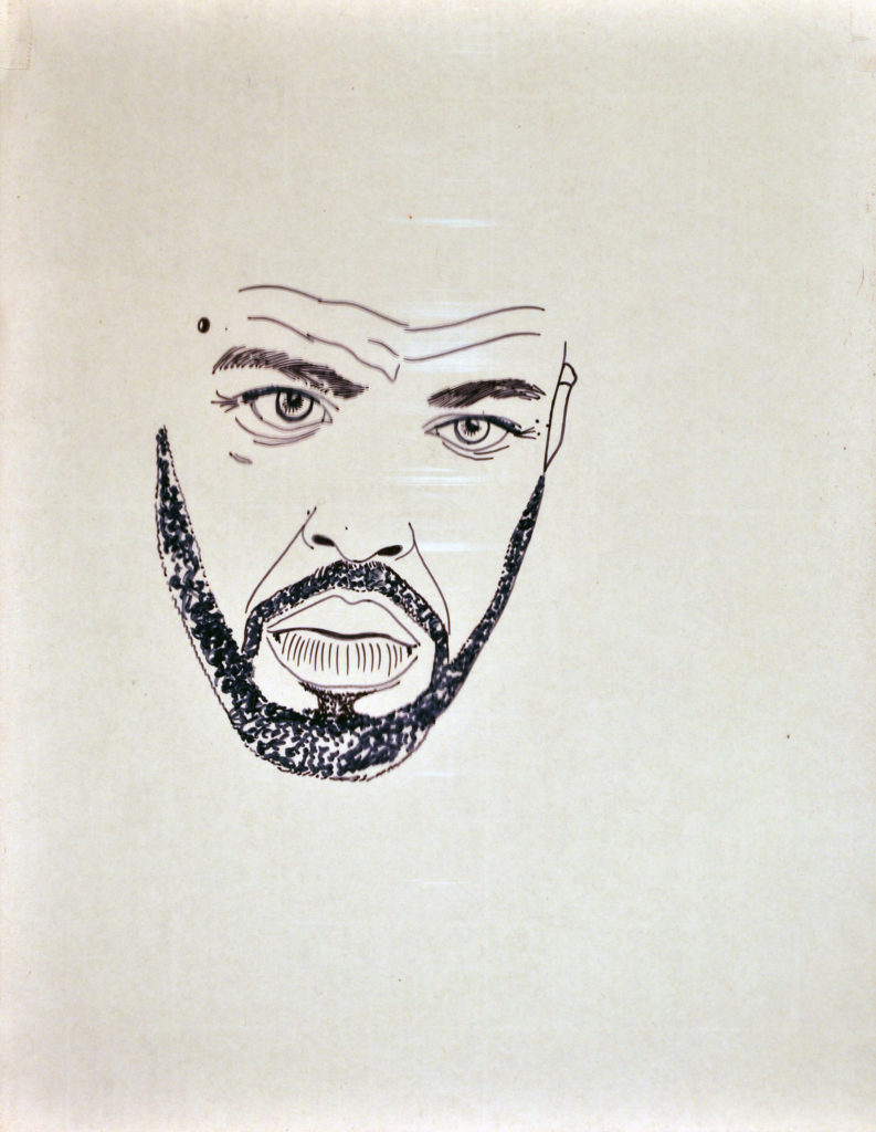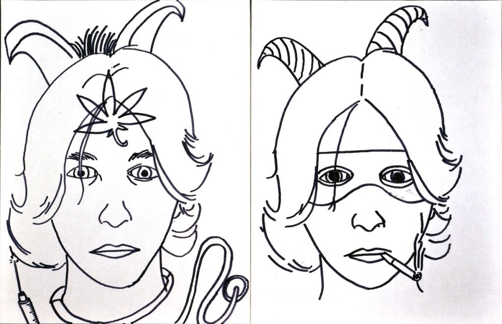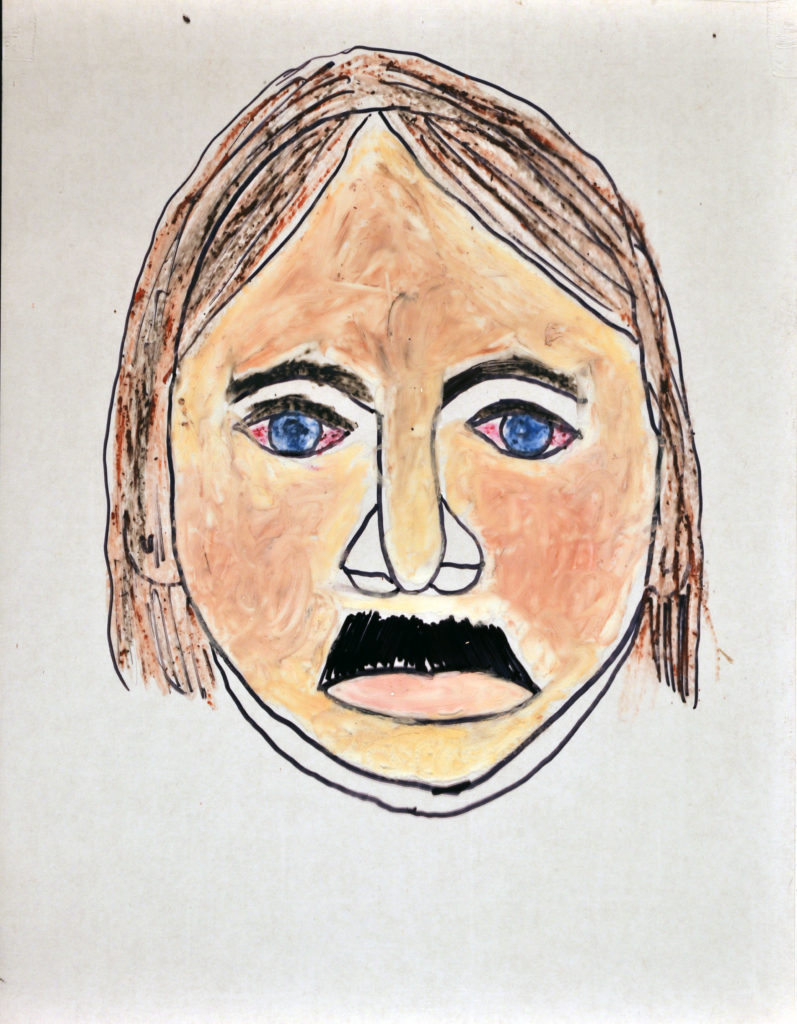 В левом верхнем углу белой страницы – глаза женщины. Внизу я нарисовала форму плеч, сжатых и мускулистых, и там, где сходятся ключицы, я нарисовал ее рот. Рот связан с правой рукой словом «Сахар», словно висит между плечом и ртом. Линия левой руки также показывает форму движения руки, опираясь на дно со словом Cane. На верхушках глаз линии волос. Цвета – красный и синий.