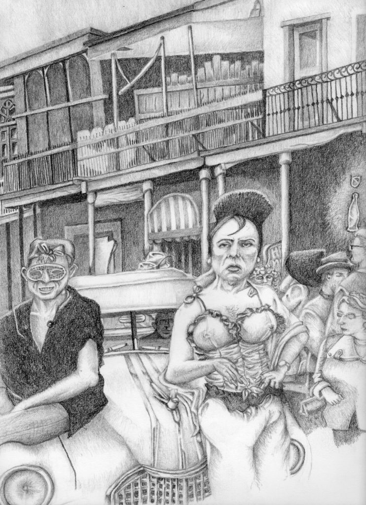 There are the eyes of the woman at the top left of a white page. Underneath I drew the shape of the shoulders, contracted and muscular, and where the clavicles converge I drew her mouth. The mouth is linked with the right arm by the word Sugar as if hanging between shoulder and mouth. The line of the left arm also shows the shape of the movement of the hand, leaning on the bottom with the word Cane. On top of the eyes the lines of the hair. Colours are red and blue.