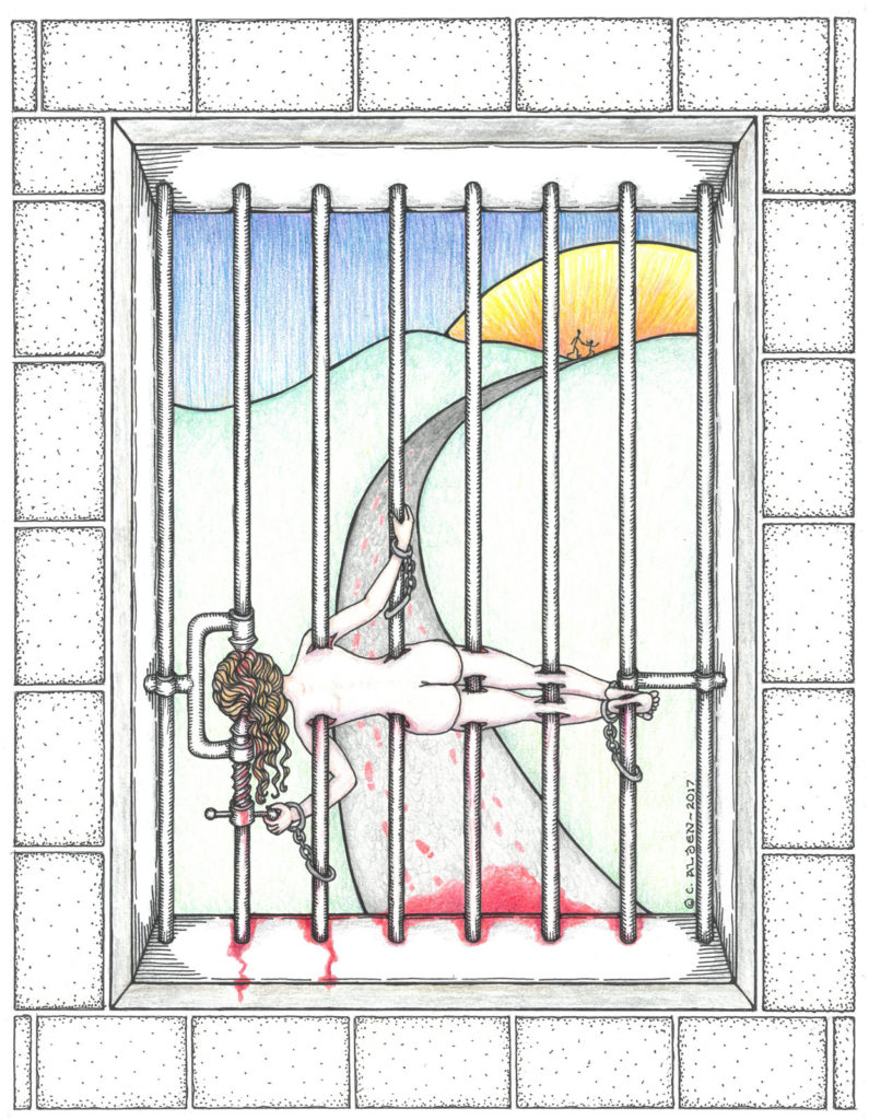 She is walking free out of the door into the night, the opposite time of day as in the original. She is unchained, walking courageously and proudly out. The bars are behind her and the path into the future goes towards the sky.