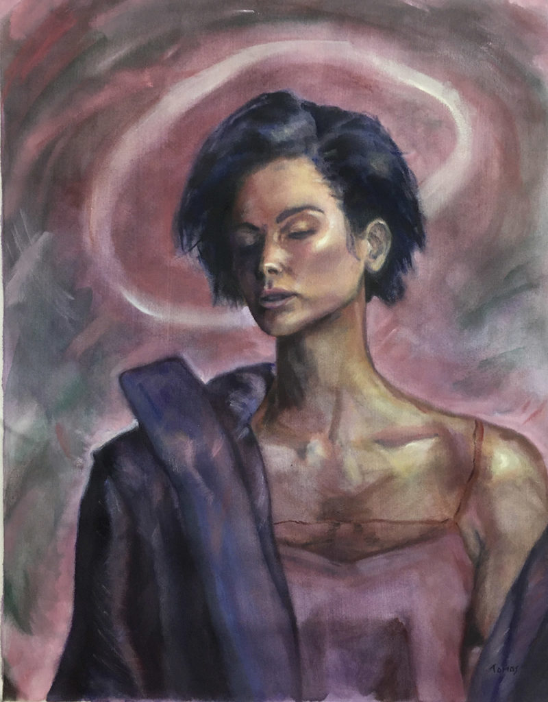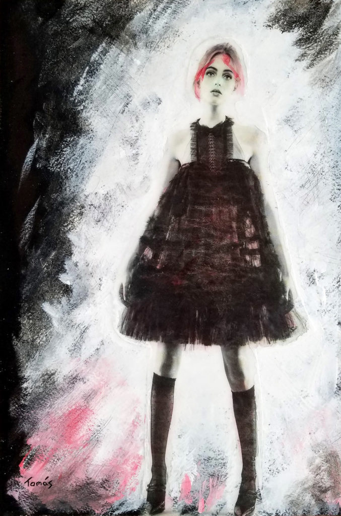 I was drawn to this women’s arms. They are so small and so pale, in contrast to the dress, that you can barely see them. I decided to translate the arms a few times on top of each other.